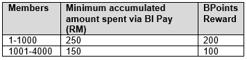 iii. The next three thousand (3000) members who spend a minimum accumulated amount of RM150 during the Campaign Period will each be awarded 100 BPoints.e BPoints Rewards Table