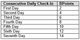 ii. Additional BPoints will be awarded to members who perform consecutive daily check-ins: BPoints Earning Table