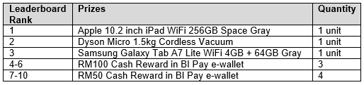 Stand a chance to win awesome prizes like an Apple 10.2 inch iPad WiFi, Dyson Micro Cordless Vacuum, Samsung Galaxy Tab A7 Lite WiFi and Cash Rewards worth RM50 & RM100! There are also daily rewards such as e-vouchers (Starbucks RM20, Lazada RM10, Grab Food RM10, etc.) and a maximum of 500 BPoints to be earned every time you play!